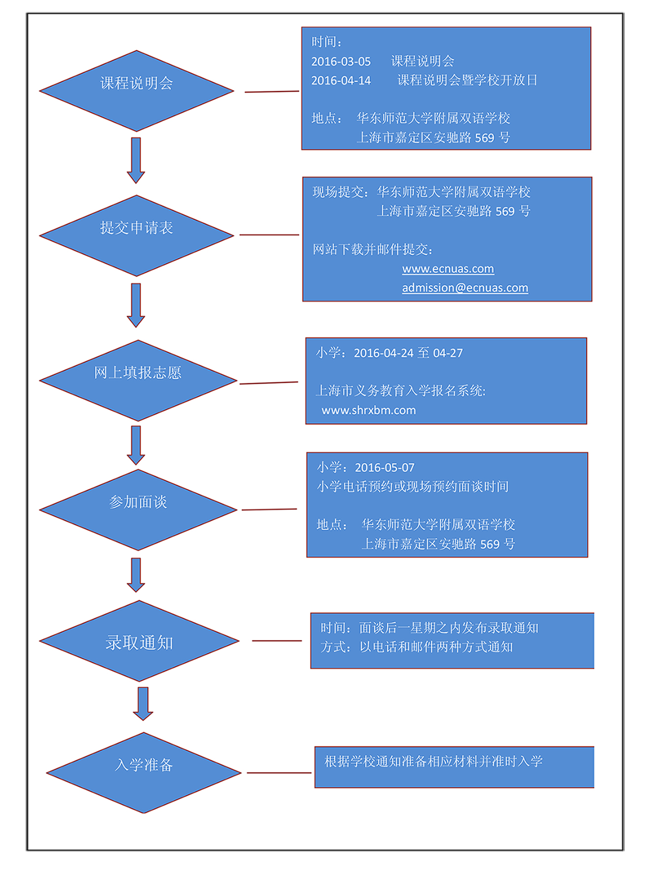 学校的招生分为课程说明会、提交申请表、参加面谈、录取通知及入学准备五个环节。每一环节的时间及场地安排如下: